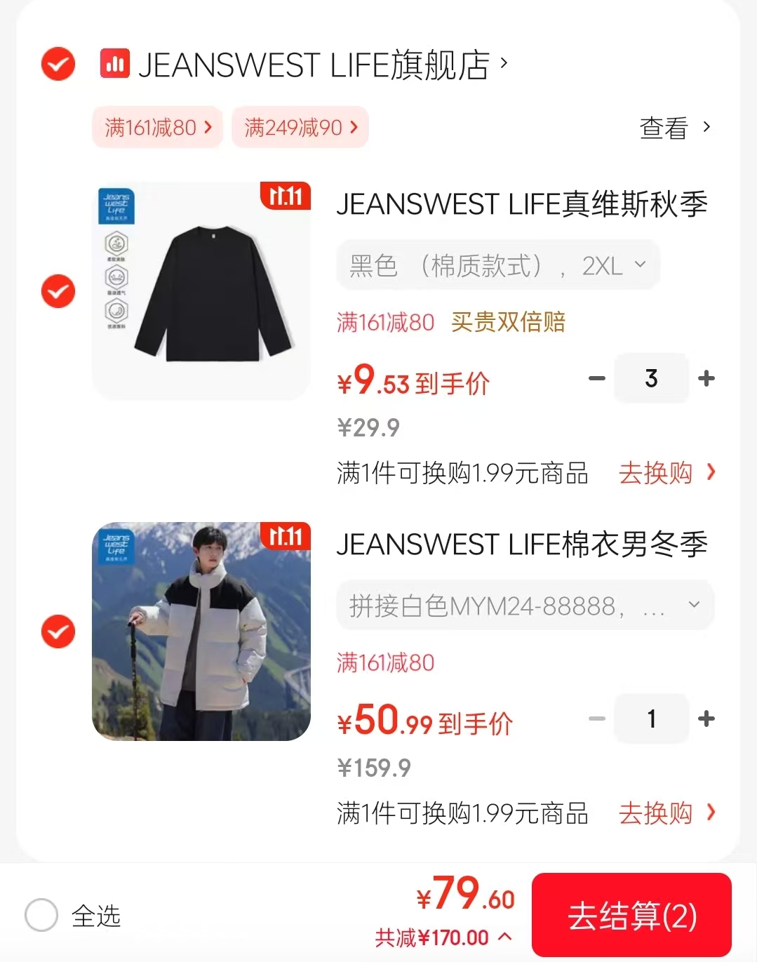 先领161-80补贴卷 真维斯 服饰组合 轻薄立领羽绒服 简约纯色休闲打底衫 一起到手79.6元